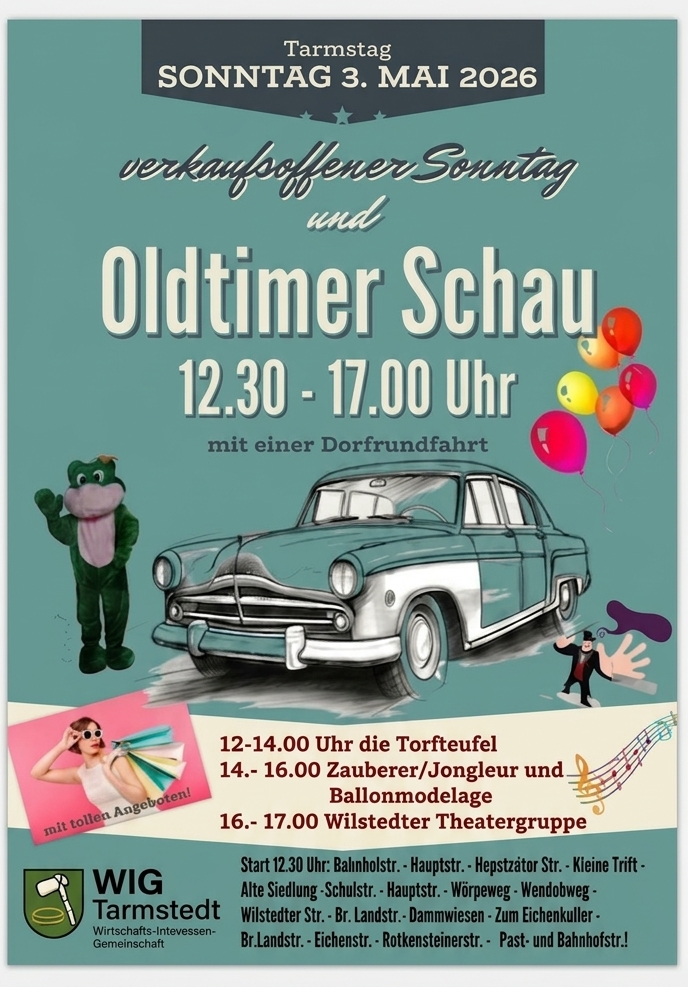 Verkaufsoffener Sonntag der WIG Tarmstedt mit Angeboten und Aktionen. Musikalisch wird die Veranstaltung voraussichtlich mit den Worpsweder Torfteufeln starten. Außerdem gibt es noch laut Planung "Zauberhaftes", Ballonmodellage und die Wilstedter Theatergruppe.