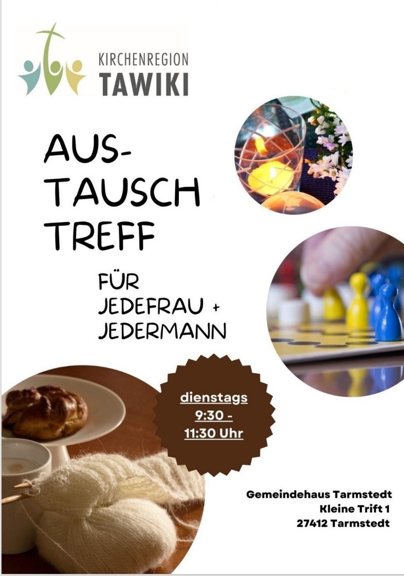 Die evangelische Kirchengemeinde hat einen neuen Aus-Tausch-Treff gegründet. Jeden Dienstag von 9.30 bis 11.30 Uhr können Interessierte zusammenkommen, um zu klönen, zu puzzeln oder zu spielen. Oder man tauscht Tipps über Rezepte, Reparaturen, Handarbeiten oder Gartenarbeiten aus. Jeden Dienstag ab 9.30 bis 11.30 Uhr!